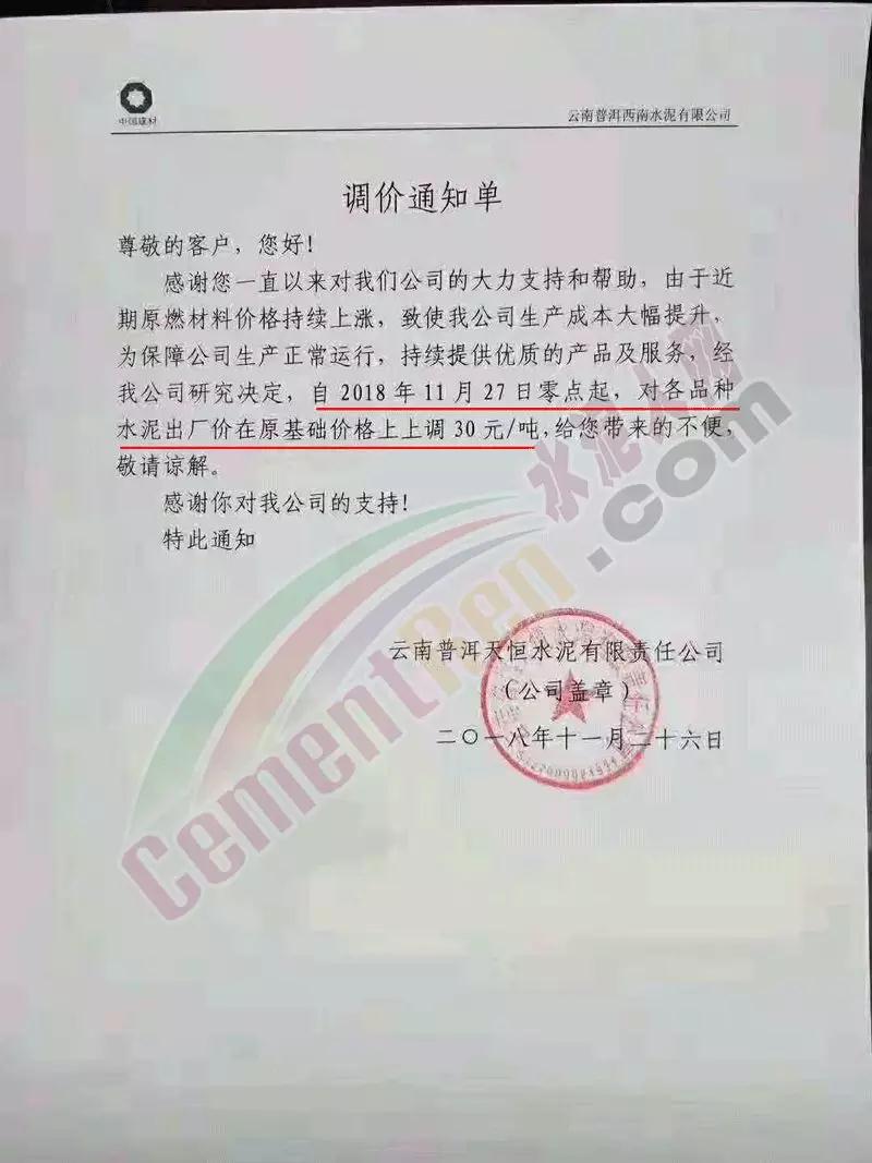 水泥人網(wǎng)最新消息:昨日(26日)云南省多家水泥企業(yè)發(fā)布調(diào)價通知稱自今日(27日)起上調(diào)各品種水泥價格。其中云南普洱西南水泥有限公司發(fā)調(diào)價通知稱,由于近期原燃材料價格持續(xù)上漲,致使公司生產(chǎn)成本大幅提升,為保障公司生產(chǎn)正常運行,持續(xù)提供優(yōu)質(zhì)的產(chǎn)品及服務(wù),經(jīng)公司研究決定自今日(27日)零點起,對各品種水泥出廠價在原基礎(chǔ)價格上上調(diào)30元/噸。