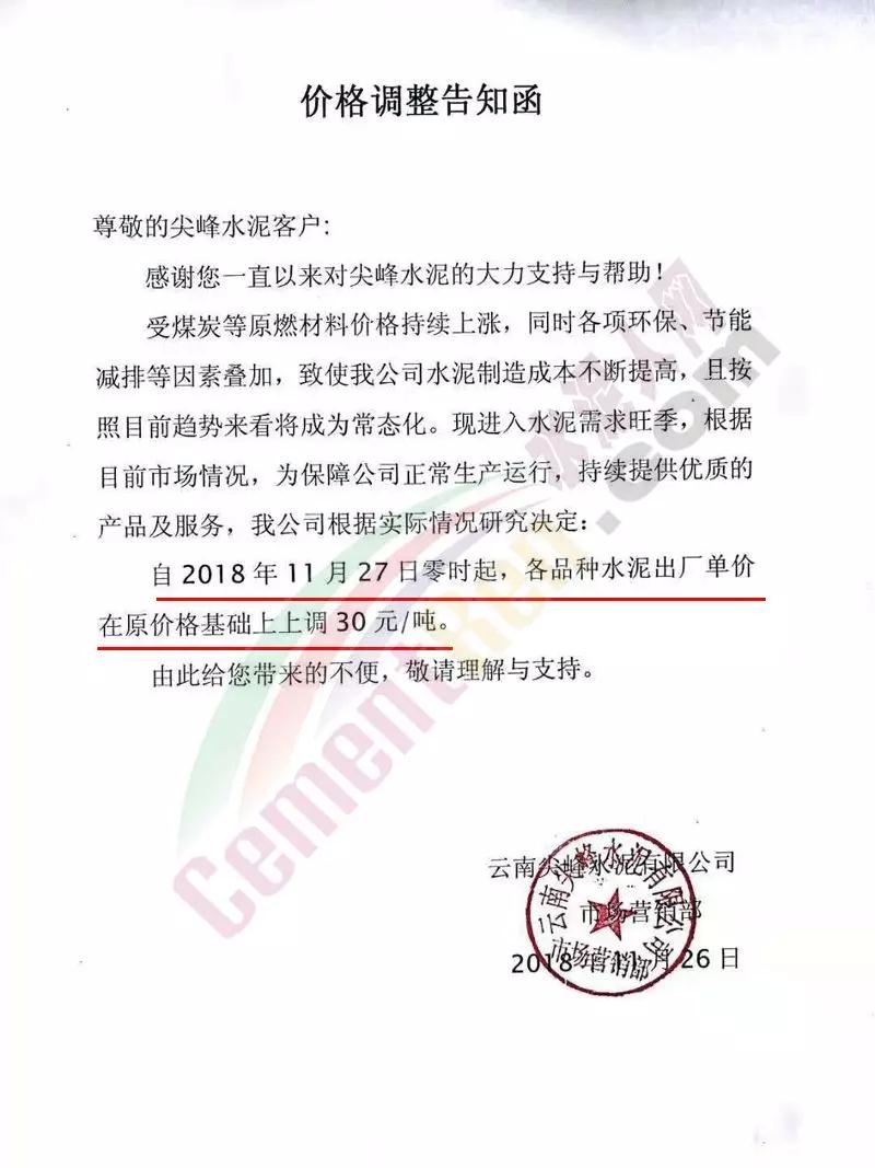 云南尖峰水泥有限公司價格調(diào)整告知函稱,受煤炭等原燃材料價格持續(xù)上漲,同時各項環(huán)保、節(jié)能減排等因素疊加,致使公司水泥制造成本不斷提高,且按照目前趨勢來看將成為常態(tài)化。現(xiàn)進入水泥需求旺季,根據(jù)目前市場情況,為保障公司正常生產(chǎn)運行,持續(xù)提供優(yōu)質(zhì)的產(chǎn)品及服務(wù),公司根據(jù)實際情況研究決定自今日(27日)零時起,各品種水泥出廠單價在原價格基礎(chǔ)上上調(diào)30元/噸。