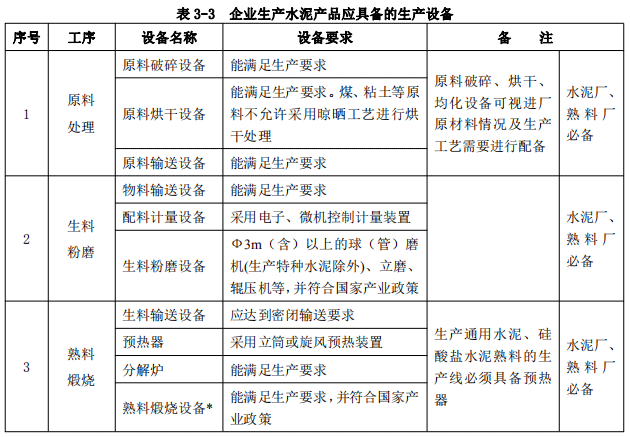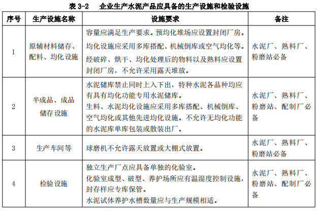 第七條 企業(yè)生產水泥產品應具備本條款規(guī)定的基本生產條件,內容包括:生產設施和檢驗設施、生產設備和檢驗設備,具體要求見表3-2至表3-4。