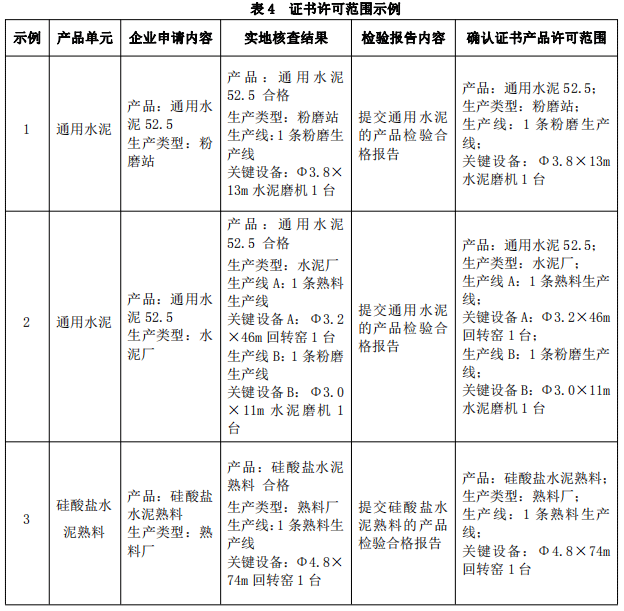 水泥產品生產許可證證書許可范圍示例如表4。