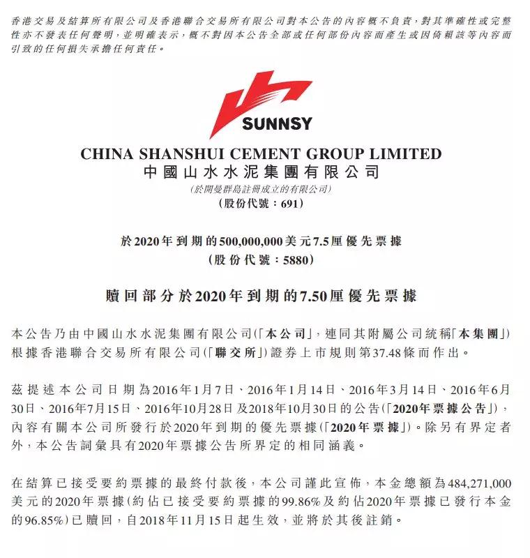 山水水泥(00691)公告,就有關(guān)于2020年到期的7.5厘優(yōu)先票據(jù),在結(jié)算已接受要約票據(jù)的最終付款后,公司宣布,本金總額為4.85億美元的2020年票據(jù)(占已接受要約票據(jù)的100%)已贖回,自2018年11月28日起生效,并將于其后注銷。