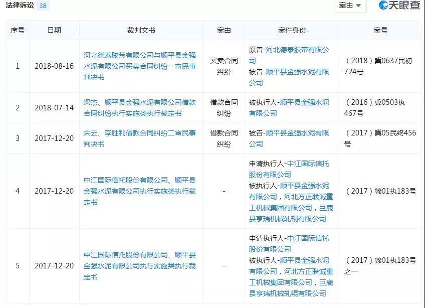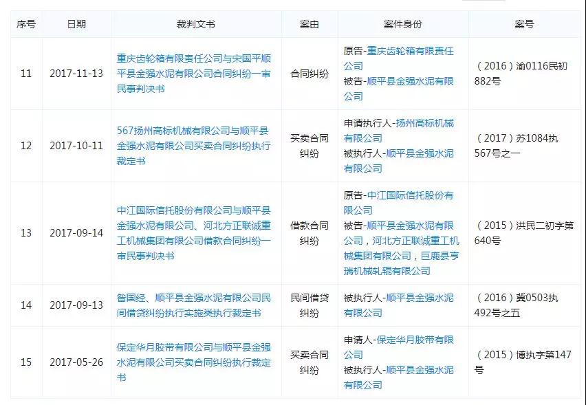 金強水泥投產(chǎn)后,似乎其發(fā)展之路并不平坦,曲折坎坷,先是2015年爆出股權(quán)轉(zhuǎn)讓京蘭水泥,后是法律訴訟案件不斷,官司纏身!相關(guān)資料顯示僅2017-2018就涉及15起法律訴訟。