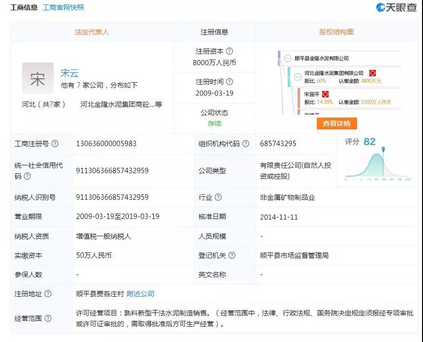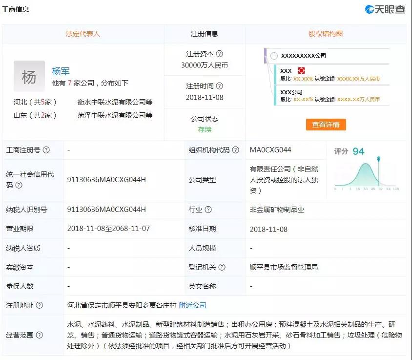 據(jù)查詢,保定中聯(lián)水泥于2018年11月8日登記注冊。法定代表人楊軍。注冊地址河北保定市順平縣安陽鄉(xiāng)賈各莊村。經(jīng)營范圍為水泥、水泥熟料、水泥制品、新型建筑材料制造銷售;出租辦公用房;預(yù)拌混凝土及水泥相關(guān)制品的生產(chǎn)、研發(fā)、銷售;普通貨物運輸;道路貨物罐式容器運輸;水泥用石灰?guī)r開采、砂石骨料加工銷售;垃圾處理等。