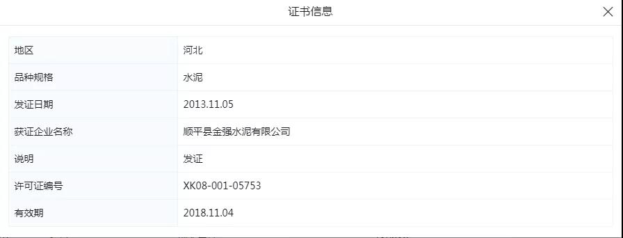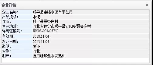 質(zhì)檢部局生產(chǎn)許可證辦公室相關(guān)數(shù)據(jù)顯示,順平縣金強水泥在2013年11月5日取得生產(chǎn)許可證,有效期至上月4日止。其產(chǎn)品明細為通用硅酸鹽水泥熟料。