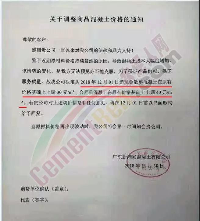 日前,廣東新港興混凝土有限公司發(fā)布了《關(guān)于調(diào)整商品混凝土價(jià)格的通知》通知稱鑒于近期原材料價(jià)格持續(xù)暴漲的原因,導(dǎo)致混凝土成本大幅增加。該情勢的變化,是企業(yè)無法預(yù)見亦不能克服的。為了保證產(chǎn)品供應(yīng),保證服務(wù)質(zhì)量。公司決定從12月1日起現(xiàn)金散單混凝土在原有價(jià)格基礎(chǔ)上上調(diào)30元/立方米,合同單混凝土在原有價(jià)格基礎(chǔ)上上調(diào)40元/立方米。
