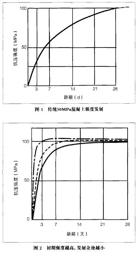 圖1是傳統(tǒng)的混凝土強度正常發(fā)展規(guī)律:相對于28天的100%,3天約30%;7天約60%。