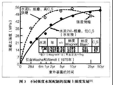 美國的Withy在威斯康辛大學(xué)從1910年開始了50年水泥凈漿、砂漿和混凝土的實驗計劃,澆筑了室內(nèi)和室外混凝土。分別于1910年、1923年和1937年3個不同時間成型了5000多個試件。Washa和Wendt于1975年發(fā)表了這些試件觀測50年的結(jié)果。結(jié)果是:1923年用Blaine細(xì)度為5775px2/kg的水泥配制的混凝土28天強度為21MPa,25年強度達(dá)到52MPa;1937年用當(dāng)時的快硬水泥配制的混凝土28天強度為35MPa,5年達(dá)到53MPa,10年后強度開始倒縮,25年強度就倒縮至45MPa,比水化慢的混凝土25年強度還低。當(dāng)時的快硬水泥與當(dāng)今美國的I型水泥和II型水泥礦物組成與細(xì)度相當(dāng)(C3S為57%,勃氏比表面積為380㎡/kg,我國常用水泥也如此)見圖3。