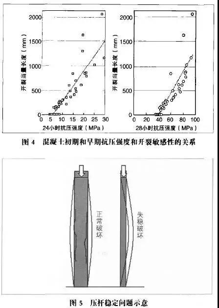 3)凡是提高早期強度的措施對混凝土后期性能都會有損害,這已是國內(nèi)外專家的共識。前RILEM主席、德國混凝土專家RupertSpringenschmid證明控制混凝土12小時抗壓強度不超過6MPa,就可以避免混凝土的早期開裂;我國混凝土專家黃士元經(jīng)過試驗得出結(jié)論:可用混凝土24小時抗壓強度不超過12MPa來控制混凝土的早期開裂(見圖4)。