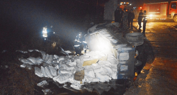 消防人員到達(dá)現(xiàn)場(chǎng)后了解到,貨車(chē)裝載著貨物在通過(guò)泥濘的上坡路段時(shí)因動(dòng)力不足和側(cè)滑導(dǎo)致車(chē)輛滑坡側(cè)翻入河內(nèi),雖然河水較淺但被散落的水泥袋阻斷了河流,如果不及時(shí)將駕駛員救出很可能造成駕駛員溺水身亡。隨即,消防指戰(zhàn)員立即部署作戰(zhàn)任務(wù):一組人員利用液壓工具組對(duì)駕駛室進(jìn)行擴(kuò)張和支撐;另一組人員清理河內(nèi)貨物同時(shí)利用散落的水泥袋將車(chē)輛周?chē)鷩鷵踝柚柜{駛室內(nèi)水位上漲。