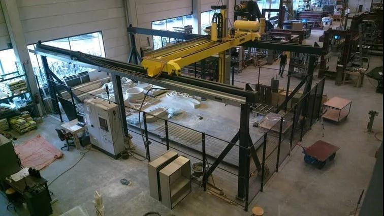 鋼鐵大橋MX3D研究和發(fā)展公司利用3D混凝土打印技術(shù)“打印”出一座鋼鐵橋梁。該橋長(zhǎng)約24英尺,位于荷蘭阿姆斯特丹市中心,擁有非常復(fù)雜的幾何學(xué)設(shè)計(jì)。該公司利用建筑專(zhuān)用3D打印機(jī)器人歷時(shí)兩個(gè)月便完成了一座精美的鋼鐵大橋。