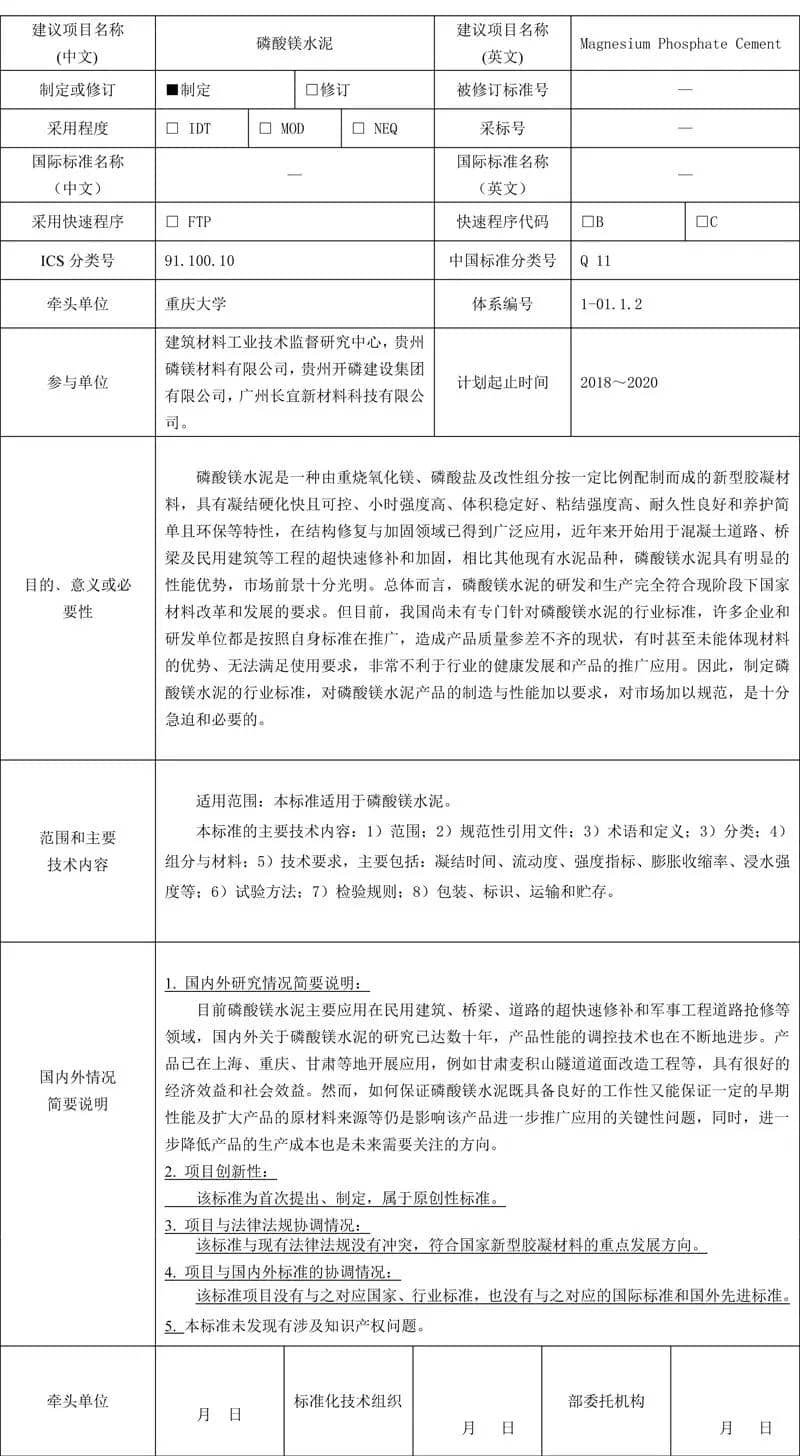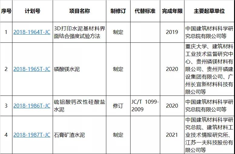 備注:上述項(xiàng)目主管部門均屬工信部原材料工業(yè)司。技術(shù)委員會(huì)或技術(shù)歸口單位均為全國水泥標(biāo)準(zhǔn)化技術(shù)委員會(huì)。標(biāo)準(zhǔn)性質(zhì)均為推薦。