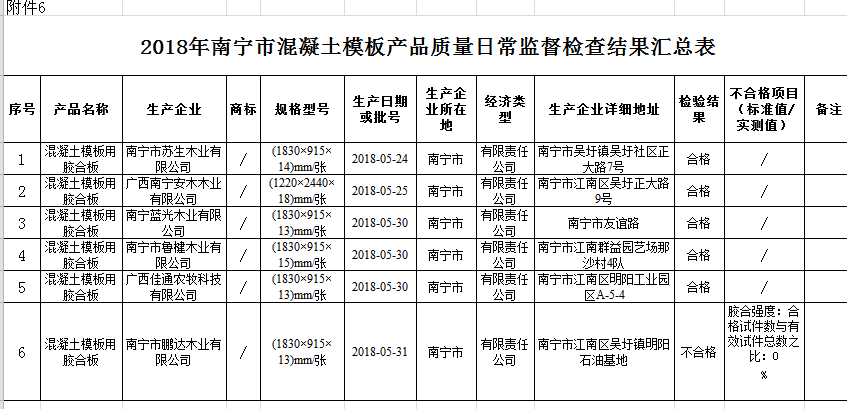 3.2018年南寧市人造板產(chǎn)品質(zhì)量日常監(jiān)督檢查結(jié)果匯總表