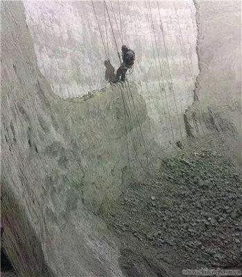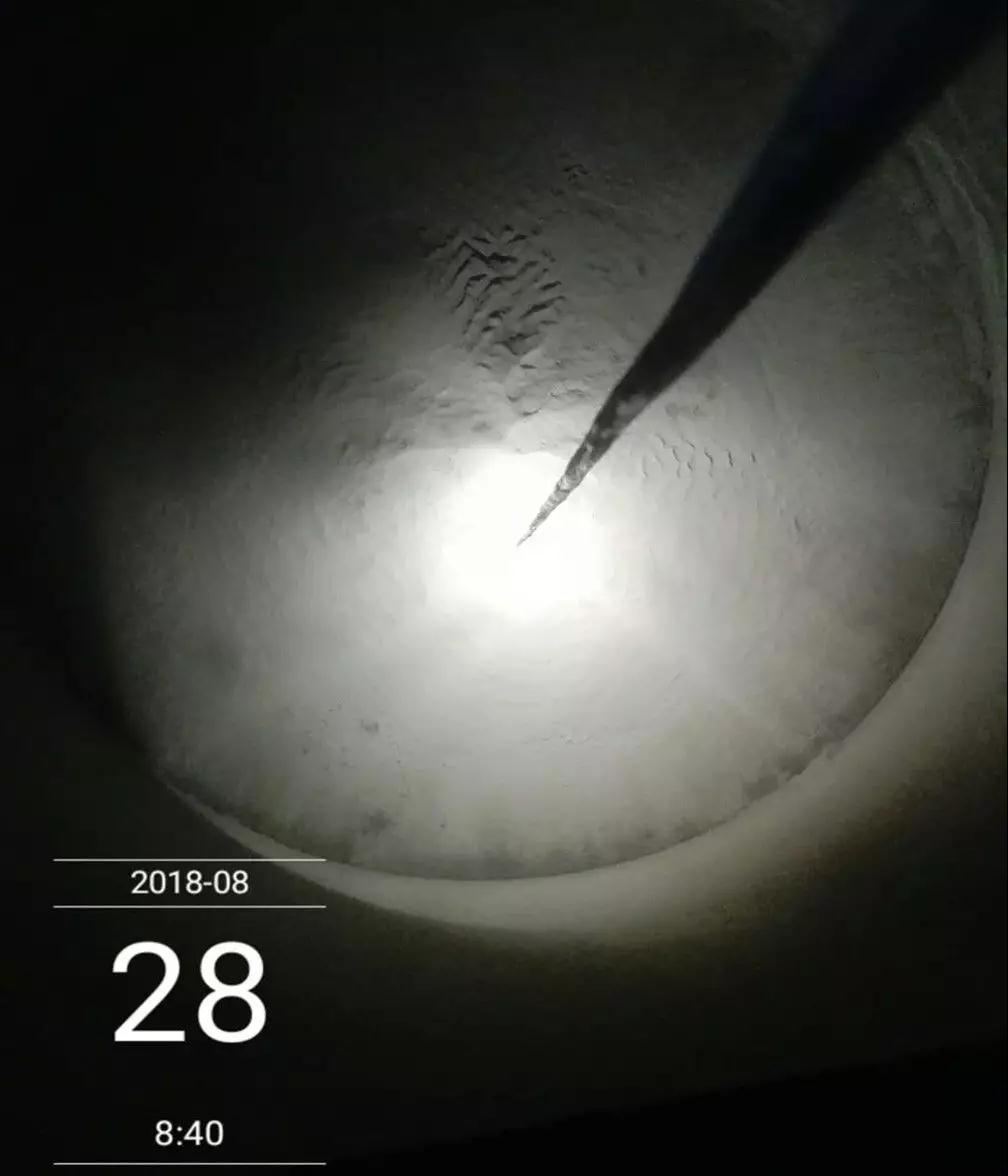 3. 清庫就是因為死料一步步積累而來,事實上在沒有徹底堵死的時候,我們的水泥庫都是嚴(yán)重帶病運行的。等到必須清庫時,無論是人工方式還是機器方式,減壓錐的存在反而變成了巨大的料路疏通障礙;因為大量死料多數(shù)處于板結(jié)硬化狀態(tài),清理下來的往往是流動性極差的塊粉混合料,其疏通死角有時不得不靠人加以處理,如圖5所示,在高位堆積受力極不穩(wěn)定的庫內(nèi)環(huán)境,這正是誘發(fā)重大傷亡事故的原因所在。