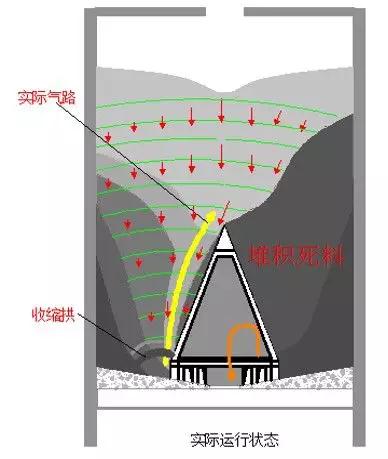 無論新庫還是重新清庫后的存儲,事實其料路發(fā)展都像立雞蛋易倒一般,極易形成不斷自我放大的多點氣路偏移聚合作用(中部多股分散漏斗流),如圖4所示。最后必然發(fā)展形成少數(shù)單點料路日益增長發(fā)展的對應(yīng)死料偏庫現(xiàn)象,遠(yuǎn)非人們自以為是氣路鋪設(shè)布局不均,氣箱磨損失效,庫壁及減壓錐面不光滑,人員操作不當(dāng)?shù)鹊仍颉?/p>