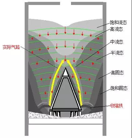2. 一旦偏庫運行,庫內(nèi)就易形成30%以上庫容的偏移性死料,將實際庫型改變成不規(guī)則的斜坡形料庫,如圖4所示。減壓錐底部與庫底硬料區(qū)還存在明顯的料路收縮作用,如果再滿庫高料位運行,庫底硬料承重擠壓將加強收縮拱的阻塞作用;當(dāng)收縮拱阻力大于氣路流化力時,吹入空氣無法滲透物料拱阻層打通料路,全庫將徹底陷于阻斷狀態(tài),如圖5所示。運氣好的,可以通過人工長鋼釬勉強破解;運氣差的,放料流量越來越小,時斷時續(xù)只能全盤清庫。