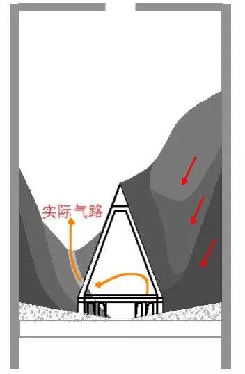 然而,人們都忽視了庫內(nèi)粉體分層重力拱產(chǎn)生的料重外擴集膚疊加效應(yīng),實際上庫內(nèi)密度分布是外壁硬內(nèi)空軟,偏偏低密度的外加空氣必然走軟不走硬,因此注定了整個系統(tǒng)處于偏移發(fā)散性力學(xué)傳導(dǎo)模式,如圖3所示。