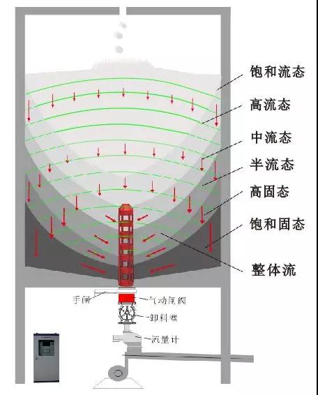 歷經(jīng)多年的研究與試驗,昆明艾克自動化公司發(fā)現(xiàn)了重力拱作用會形成庫壁高密度硬料聚集層疊加效應(yīng),從而確定庫壁及底部硬料是死料形成的溫床。只有讓環(huán)庫壁及底部硬料均衡優(yōu)先卸放流動,才可形成整體流,進(jìn)而徹底消除庫壁水分滲漏、凝析凝析引發(fā)的嚴(yán)重粘連、板結(jié)、固化,同時還應(yīng)考慮形成料位偏移的自動糾偏作用,在庫底則應(yīng)重點持續(xù)破解出口上方因粉料同時向心匯聚而在水平與垂直方向形成的動態(tài)收縮拱阻礙。