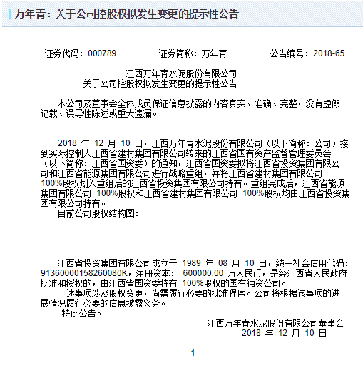 根據(jù)安源煤業(yè)集團(tuán)股份有限公司關(guān)于控股股東實(shí)施戰(zhàn)略重組的提示性公告顯示,接到控股股東江西省能源集團(tuán)有限公司(以下簡稱“江能集團(tuán)”)通知,江能集團(tuán)于2018年12月10日收到江西省國有資產(chǎn)監(jiān)督管理委員會(以下簡稱“江西省國資委”)通知,擬將江西省投資集團(tuán)有限公司(以下簡稱“江西省投資集團(tuán)”)和江能集團(tuán)進(jìn)行戰(zhàn)略重組,重組完成后,江能集團(tuán)100%股權(quán)由江西省投資集團(tuán)持有。目前,相關(guān)程序正報江西省政府批準(zhǔn)。與此同時,萬年青也發(fā)布公告,江西省國資委擬將江西省投資集團(tuán)和江西省能源集團(tuán)進(jìn)行戰(zhàn)略重組,并將江西省建材集團(tuán)100%股權(quán)劃入重組后的江西省投資集團(tuán)持有。重組完成后,江西省能源集團(tuán)100%股權(quán)和江西省建材集團(tuán)100%股權(quán)均由江西省投資集團(tuán)持有。
