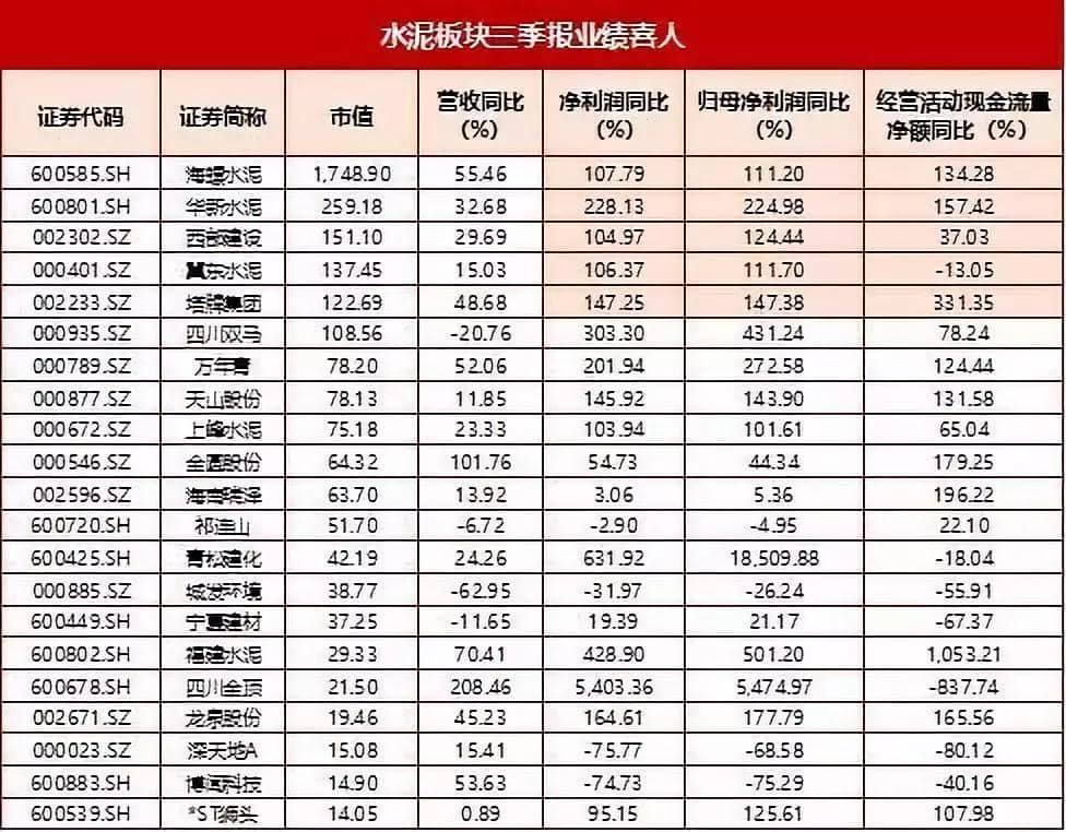 數(shù)據(jù)顯示,今年前三季度,水泥板塊共實現(xiàn)營業(yè)收入1719.89億元,同比增長33.45%;實現(xiàn)凈利潤329.28億元,同比增長115.61%。21家水泥行業(yè)上市公司中,17家今年前三季度凈利潤同比實現(xiàn)增長,14家同比增長超過100%。以水泥市值的前五家公司來看,海螺水泥、華新水泥、西部建設(shè)、冀東水泥、塔牌集團的凈利潤同比增速在三季度均超過100%。