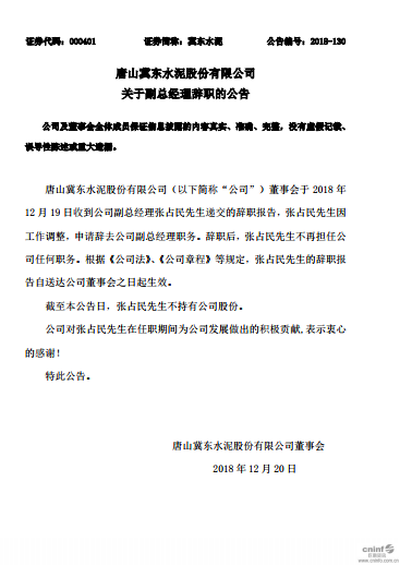唐山冀東水泥股份有限公司(以下簡稱“公司”)董事會于2018年12月19日收到公司副總經(jīng)理張占民先生遞交的辭職報告,張占民先生因工作調(diào)整,申請辭去公司副總經(jīng)理職務(wù)。
