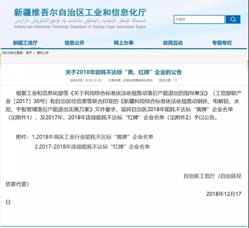 日前,新疆維吾爾自治區(qū)工信廳發(fā)布了《關(guān)于2018年能耗不達(dá)標(biāo)“黃、紅牌”企業(yè)的公告》公告文件稱,根據(jù)工信部等《關(guān)于利用綜合標(biāo)準(zhǔn)依法依規(guī)推動落后產(chǎn)能退出的指導(dǎo)意見》(工信部聯(lián)產(chǎn)業(yè)〔2017〕30號)和新疆維吾爾自治區(qū)經(jīng)信委等聯(lián)合印發(fā)的《新疆利用綜合標(biāo)準(zhǔn)依法依規(guī)推動鋼鐵、電解鋁、水泥、平板玻璃落后產(chǎn)能退出實(shí)施方案》文件要求,將自治區(qū)2018年能耗不達(dá)標(biāo)“黃牌”企業(yè)名單及2017年、2018年連續(xù)能耗不達(dá)標(biāo)“紅牌”企業(yè)名單予以公告。名單中包括三家水泥企業(yè)分別為:2018年新疆區(qū)工業(yè)行業(yè)能耗不達(dá)標(biāo)“黃牌”水泥企業(yè)名單為新疆和靜天山水泥有限責(zé)任公司。2017-2018年新疆區(qū)工業(yè)行業(yè)能耗連續(xù)不達(dá)標(biāo)“紅牌”水泥企業(yè)3家,分別為精河縣昆侖水泥有限公司、皮山杜瓦玉山水泥有限責(zé)任公司和田魯新建材有限公司
