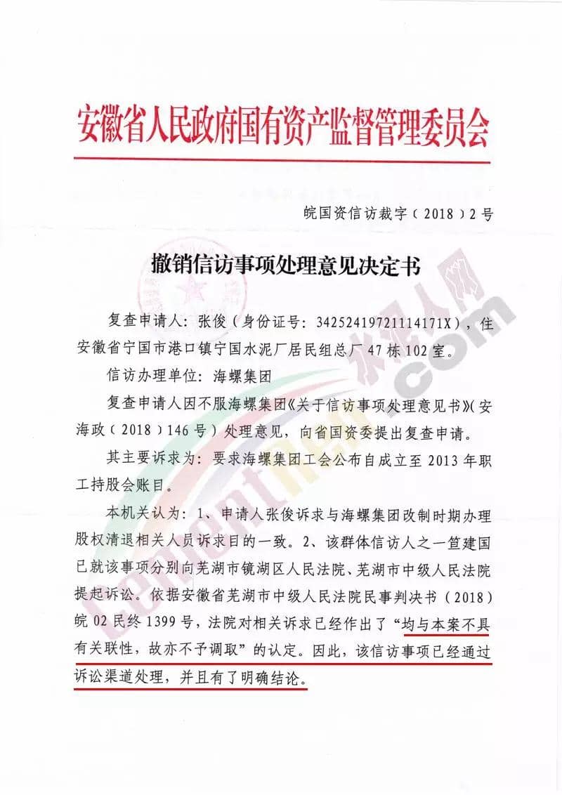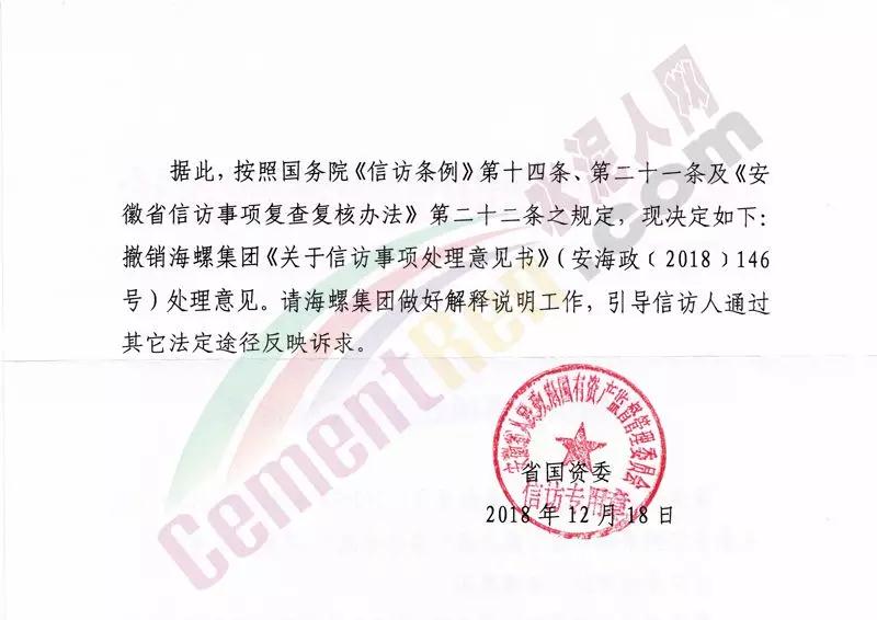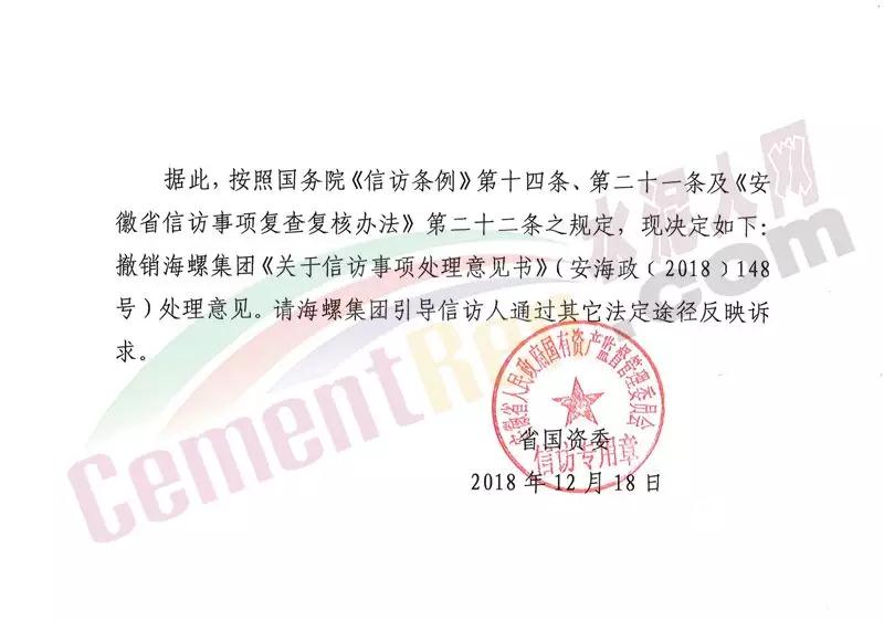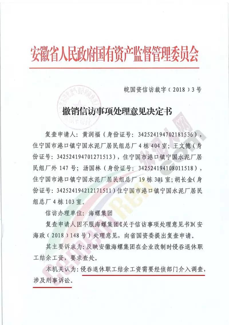 同期,安徽省人民政府國有資產(chǎn)監(jiān)督管理委員會發(fā)布了《撤銷信訪事項處理意見決定書》(皖國資信訪裁字【2018】3號)文件。文件稱,針對相關人員反映海螺集團在企業(yè)改制時侵吞退休職工結(jié)余工資一事。需要經(jīng)偵部門介入調(diào)查,涉及刑事訴訟。按照國務院《信訪條例》相關條款規(guī)定,撤銷海螺集團《關于信訪事項處理意見書》(安海政【2018】148號)處理意見。請海螺集團引導信訪人通過其他法定途徑反映訴求。文件原文如下: