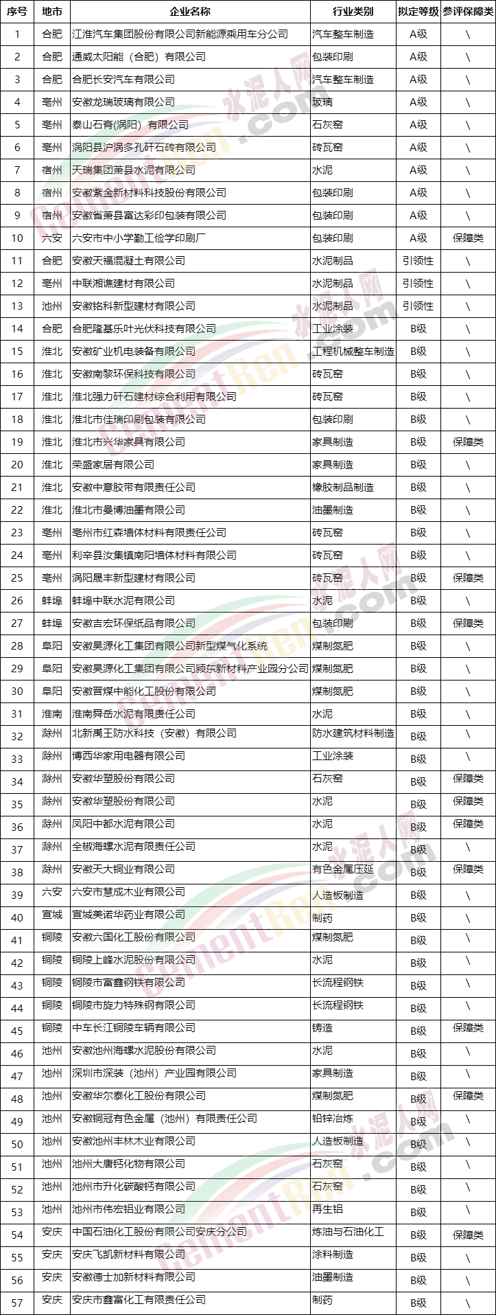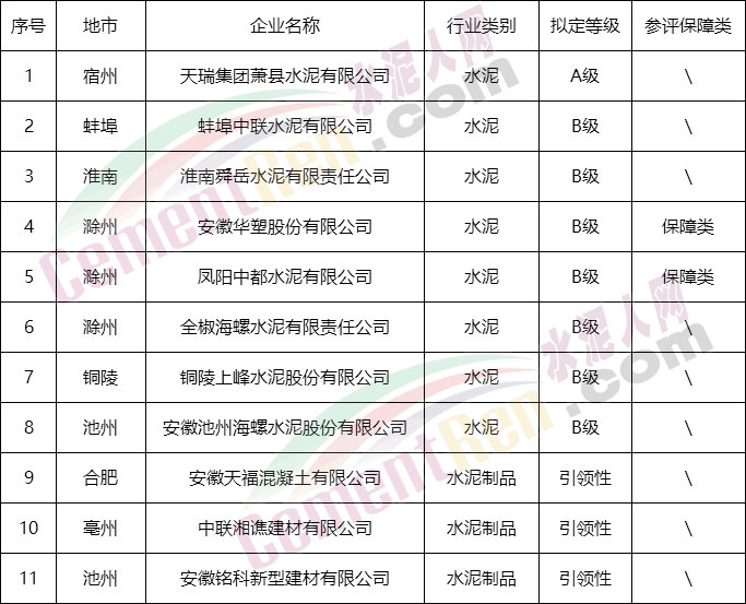 水泥行業(yè)天瑞集團(tuán)蕭縣水泥有限公司擬被評為A級企業(yè),蚌埠中聯(lián)水泥有限公司、淮南舜岳水泥有限責(zé)任公司、安徽華塑股份有限公司、鳳陽中都水泥有限公司、全椒海螺水泥有限責(zé)任公司、銅陵上峰水泥股份有限公司、安徽池州海螺水泥股份有限公司7家企擬評B。安徽天?;炷劣邢薰尽⒅新?lián)湘譙建材有限公司、安徽銘科新型建材有限公司3家水泥制品企業(yè)擬評引領(lǐng)性企業(yè)。
