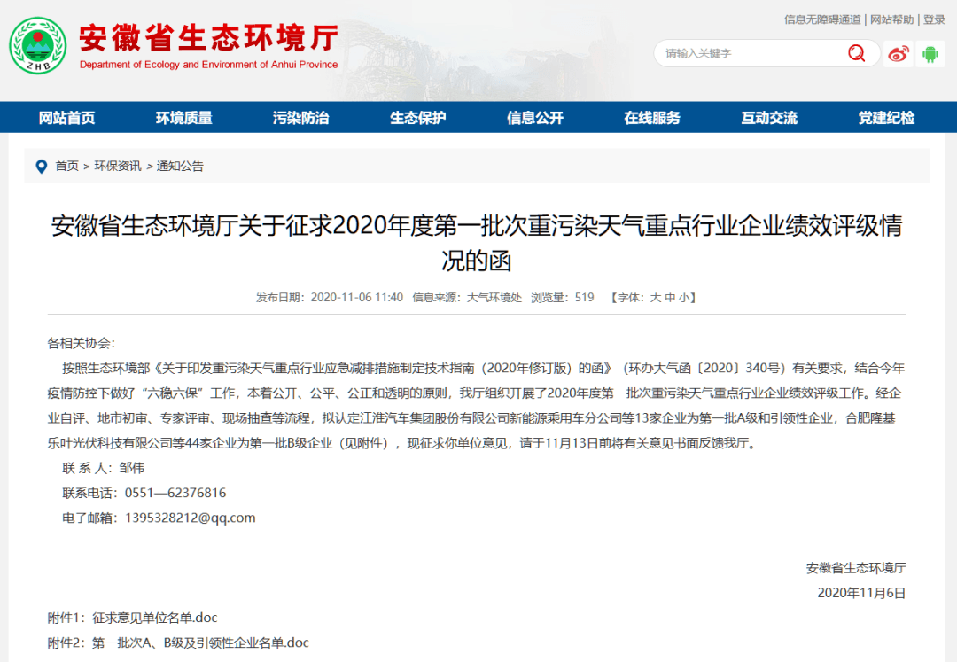 日前,安徽省生態(tài)環(huán)境廳發(fā)布《安徽省生態(tài)環(huán)境廳關(guān)于征求2020年度第一批次重污染天氣重點行業(yè)企業(yè)績效評級情況的函》稱,按照生態(tài)環(huán)境部《關(guān)于印發(fā)重污染天氣重點行業(yè)應(yīng)急減排措施制定技術(shù)指南(2020年修訂版)的函》(環(huán)辦大氣函〔2020〕340號)有關(guān)要求,結(jié)合今年疫情防控下做好“六穩(wěn)六保”工作,本著公開、公平、公正和透明的原則,安徽生態(tài)環(huán)境廳組織開展了2020年度第一批次重污染天氣重點行業(yè)企業(yè)績效評級工作。