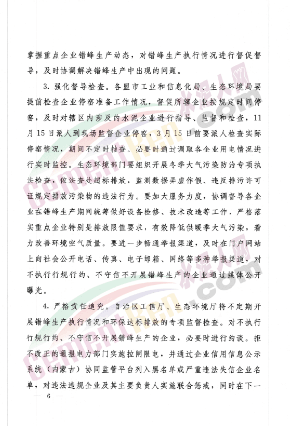 內(nèi)蒙古自治區(qū)工業(yè)和信息化廳、生態(tài)環(huán)境廳將不定期開展錯峰生產(chǎn)執(zhí)行情況和環(huán)保達(dá)標(biāo)排放的專項監(jiān)督檢查。對不執(zhí)行行規(guī)行約、不守信不開展錯峰生產(chǎn)的企業(yè),必要時進(jìn)行約談。拒不改正的通報電力部門實施拉閘限電,并通過企業(yè)信用信息公示系統(tǒng)(內(nèi)蒙古)協(xié)同監(jiān)管平臺列入黑名單或嚴(yán)重違法失信企業(yè)名單,對違法違規(guī)企業(yè)及其主要負(fù)責(zé)人實施聯(lián)合懲戒,同時在下一年內(nèi)蒙古自治區(qū)工業(yè)和信息化廳按年度更新并公告的水泥熟料生產(chǎn)線清單中注明,限制其作為產(chǎn)能置換指標(biāo)交易。