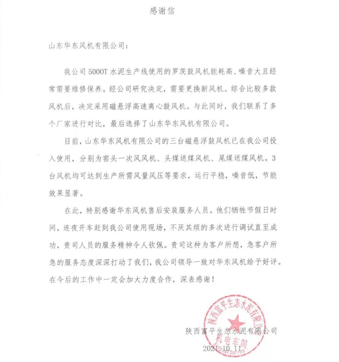 憑借專業(yè)的技術團隊、現(xiàn)代化的加工設備、完善的售后服務,華東風機幫助富平生態(tài)水泥在提高能源利用效率、降低企業(yè)綜合能耗等方面取得了突破性的進步,為此,富平生態(tài)水泥特向華東風機寄來了感謝信。