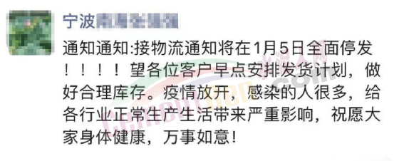 寧波一企業(yè)通知稱:接物流通知將在1月5日全面停發(fā)。望各位客戶早點(diǎn)安排發(fā)貨計(jì)劃,做好合理庫(kù)存。疫情放開,感染的人很多,給各行業(yè)正常生產(chǎn)、生活帶來(lái)嚴(yán)重影響。