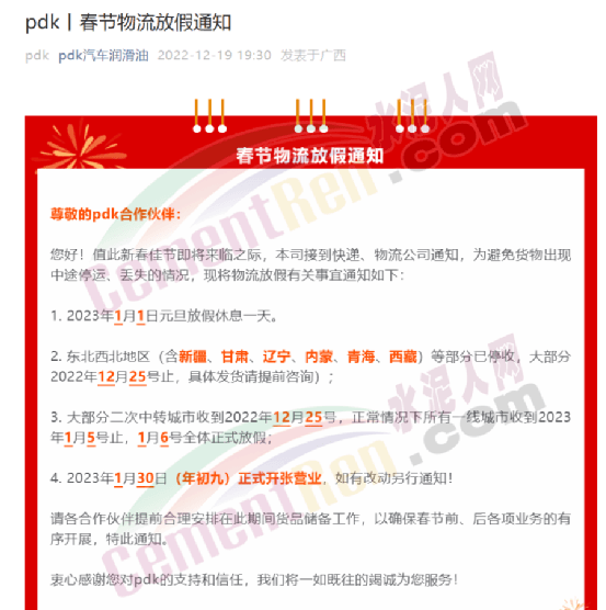 pdk汽車潤(rùn)滑油春節(jié)物流放假通知稱,公司接到快遞、物流公司通知,為避免貨物出現(xiàn)中途停運(yùn)、丟失的情況,2023年1月1日元旦放假休息一天。