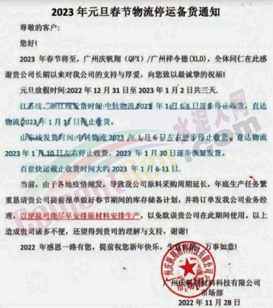 廣州慶帆翔材料科技有限公司通知,江蘇、浙江發(fā)貨時(shí)間中轉(zhuǎn)物流2023年1月6~8日逐步停止發(fā)貨,直到物流2023年1月11日停止收貨;山東發(fā)貨時(shí)間,中轉(zhuǎn)物流2023年1月6日左右逐步停止發(fā)貨,直達(dá)物流2023年1月10日左右停止收貨,2023年1月30日逐步恢復(fù)發(fā)貨。百世快運(yùn)截止收貨時(shí)間大約2023年1月6-11日。