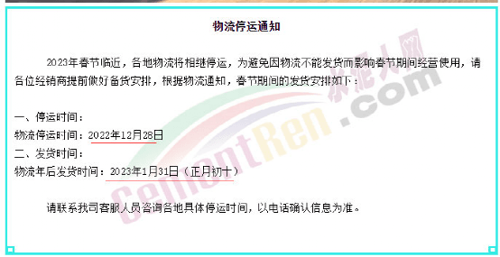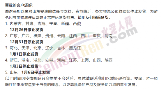 據(jù)水泥人網(wǎng)了解,目前已有多家物流公司發(fā)布春節(jié)停運(yùn)的通知。受大多物流公司停運(yùn)影響,各行各業(yè)產(chǎn)業(yè)鏈的運(yùn)行均受到一定的影響,相繼出現(xiàn)發(fā)貨困難、配套供應(yīng)緊缺及生產(chǎn)任務(wù)加重的問(wèn)題。