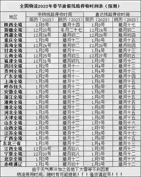 據(jù)網(wǎng)傳全國(guó)物流2023年春節(jié)放假停收時(shí)間表預(yù)測(cè),中轉(zhuǎn)線路停收時(shí)間最早從12月20日開始,直達(dá)線路停收時(shí)間最早從12月24日開始。