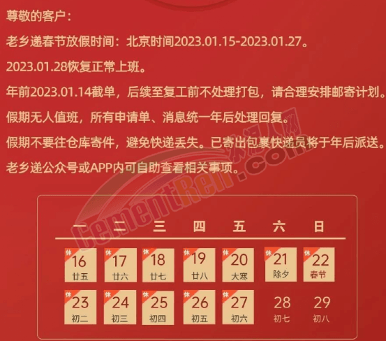 “老鄉(xiāng)遞”春節(jié)放假時(shí)間為2023年1月15日至1月27日,1月28日恢復(fù)正常上班。年前2023年1月14日截單,后續(xù)至復(fù)工前不處理打包。假期無(wú)人值班,所有申請(qǐng)單,消息統(tǒng)一年后處理回復(fù)。同時(shí)提示,假期不要往倉(cāng)庫(kù)寄件,避免快遞丟失。已寄出包裹快遞員將于年后派送。