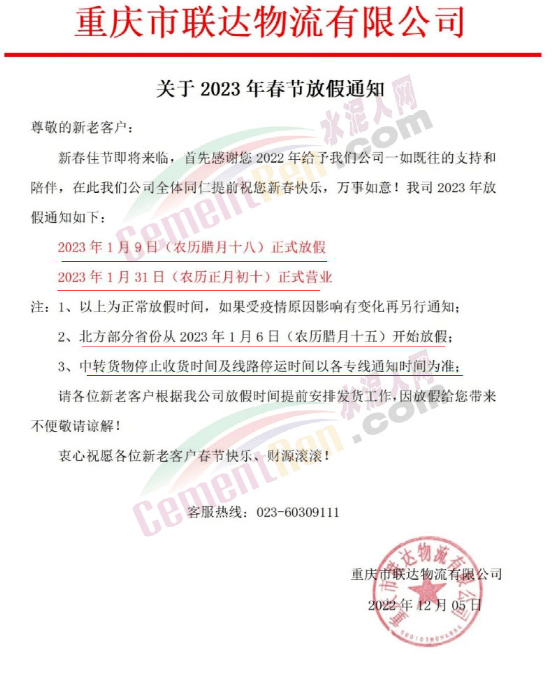 重慶市聯(lián)達(dá)物流有限公司2023年1月9日(農(nóng)歷臘月十八)正式放假,2023年1月31日(農(nóng)歷正月初十)正式營(yíng)業(yè)。如果受疫情原因影響有變化再另行通知;北方部分省份從2023年1月6日(農(nóng)歷臘月十五)開始放假;中轉(zhuǎn)貨物停止收貨時(shí)間及線路停運(yùn)時(shí)間以各專線通知時(shí)間為準(zhǔn)。