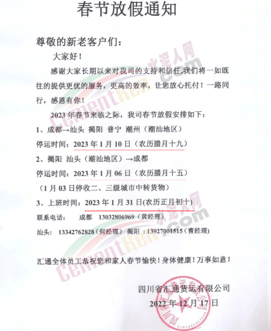 四川省匯通貨運(yùn)有限公司:成都→汕頭揭陽(yáng)普寧潮州(潮汕地區(qū))停運(yùn)時(shí)間:2023年1月10日(農(nóng)歷臘月十九)揭陽(yáng)汕頭(潮汕地區(qū))→成都。停運(yùn)時(shí)間:2023年1月06日(農(nóng)歷臘月十五)。1月03日停收二、三級(jí)城市中轉(zhuǎn)貨物。上班時(shí)間:2023年1月31日(農(nóng)歷正月初十)