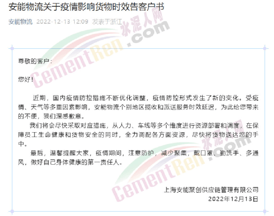 上海安能聚創(chuàng)供應(yīng)鏈管理有限公司通知稱,近期,國(guó)內(nèi)疫情防控措施不斷優(yōu)化調(diào)整,疫情防控形勢(shì)發(fā)生了新的變化。受疫情、天氣等多重因素影響,安能物流個(gè)別地區(qū)攬收和派送服務(wù)時(shí)效延遲。