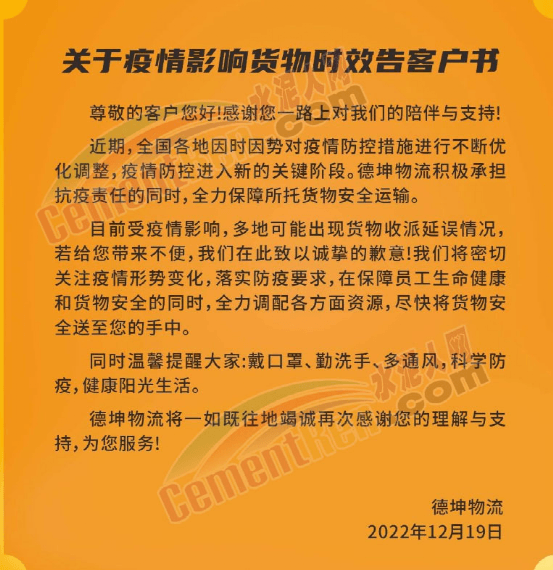 德坤物流關(guān)于疫情影響貨物時(shí)效告客戶書稱,近期,全國(guó)各地因時(shí)因勢(shì)對(duì)疫情防控措施進(jìn)行不斷優(yōu)化調(diào)整,疫情防控進(jìn)入新的關(guān)鍵階段,疫情影響,多地可能出現(xiàn)貨物收派延誤情況,德坤物流積極承擔(dān)抗疫責(zé)任的同時(shí),全力保障所托貨物安全運(yùn)輸。