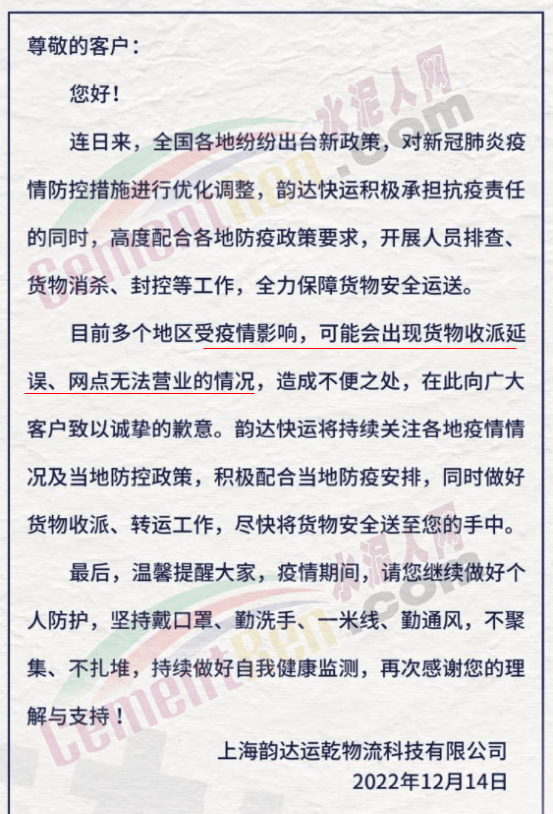 上海韻達(dá)運(yùn)乾物流科技有限公司通知,連日來(lái),全國(guó)各地紛紛出臺(tái)新政策,對(duì)新冠肺炎疫情防控措施進(jìn)行優(yōu)化調(diào)整,目前多個(gè)地區(qū)受疫情影響,可能會(huì)出現(xiàn)貨物收派延誤、網(wǎng)點(diǎn)無(wú)法營(yíng)業(yè)的情況,造成不便之處,在此向廣大客戶致以誠(chéng)摯的歉意。