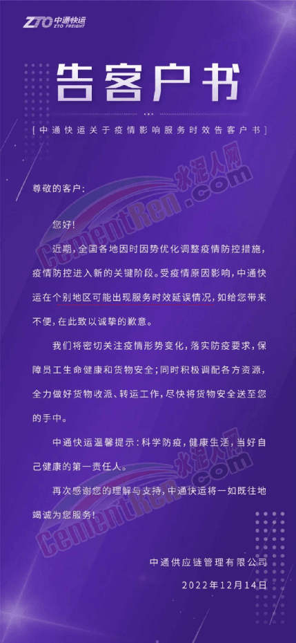 中通快運(yùn)關(guān)于疫情影響服務(wù)時(shí)效告客戶書稱:近期,全國(guó)各地因時(shí)因勢(shì)優(yōu)化調(diào)整疫情防控措施,疫情防控進(jìn)入新的關(guān)鍵階段。受疫情原因影響,中通快運(yùn)在個(gè)別地區(qū)可能出現(xiàn)服務(wù)時(shí)效延誤情況,如給您帶來(lái)不便,在此致以誠(chéng)摯的歉意。將密切關(guān)注疫情形勢(shì)變化,落實(shí)防疫要求,保障員工生命健康和貨物安全;同時(shí)積極調(diào)配各方資源,全力做好貨物收派、轉(zhuǎn)運(yùn)工作,盡快將貨物安全送至您的手中。