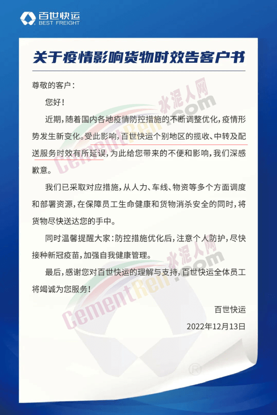 百世快運(yùn)通知,近期,隨著國(guó)內(nèi)各地疫情防控措施的不斷調(diào)整優(yōu)化,疫情形勢(shì)發(fā)生新變化。受此影響,百世快運(yùn)個(gè)別地區(qū)的攬收、中轉(zhuǎn)及配送服務(wù)時(shí)效有所延誤,為此給您帶來(lái)的不便和影響,我們深感歉意。