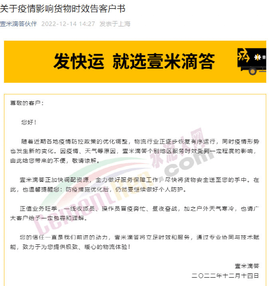 壹米滴答通知,隨著近期各地疫情防控政策的優(yōu)化調(diào)整,物流行業(yè)正逐步恢復(fù)有序運(yùn)行,同時(shí)疫情形勢(shì)也發(fā)生新的變化。因疫情、天氣等原因,壹米滴答個(gè)別地區(qū)服務(wù)時(shí)效受到一定程度的影響。
